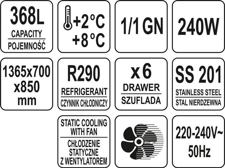 Stół chłodniczy 6-szufladowy z blatem roboczym - linia 700 marki YATO YG-05281.