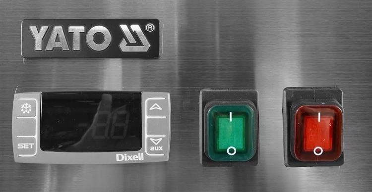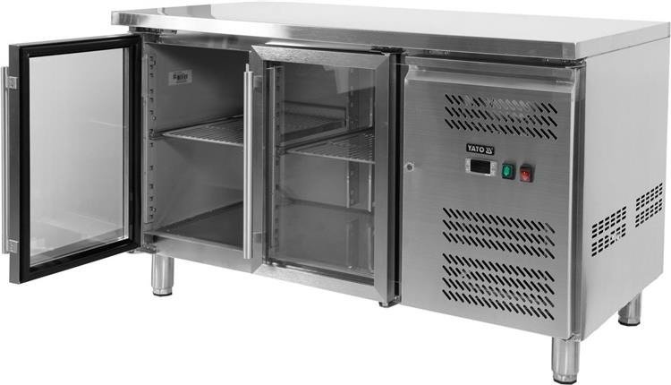 Stół do przechowywania żywości z bocznym agregatem oraz drzwiami z podwójnego, hartowanego szkła.