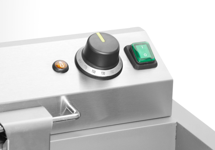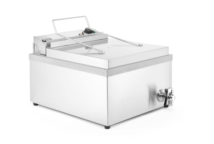 Profesjonalny smażalnik gastronomiczny o dużej pojemności, idealny do intensywnego użytkowania w kuchniach serwujących pączki, faworki, frytki i inne dania przygotowywane w głębokim tłuszczu.