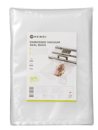 – Mogą być używane w temperaturze od -40°C do 40°C – Wytłoczenia w kształcie diamentu ułatwiają wyciąganie powietrza i uzyskanie próżni – Worki wykonane z poliamidu oraz polietylenu – Worki bez zawartości Bisfenolu A (BPA)