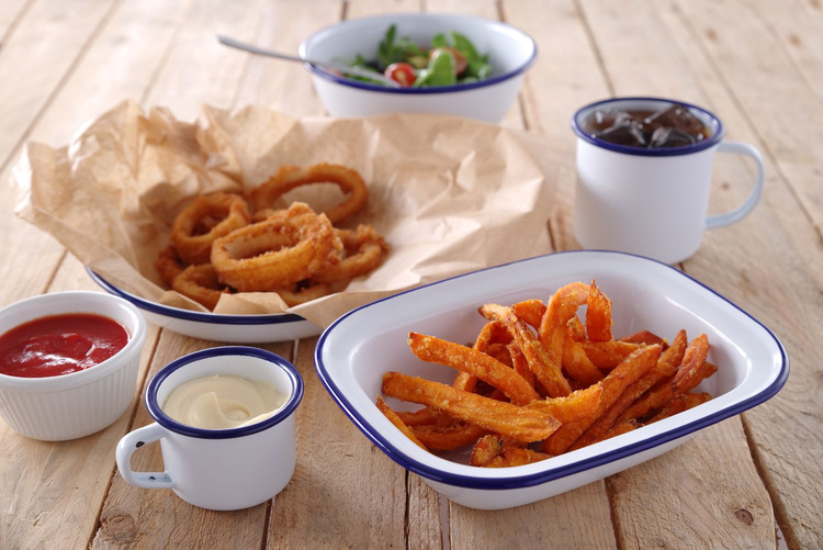 - Stal pokryta białą emalią z delikatnym niebieskim brzegiem -