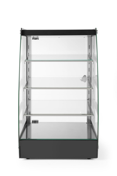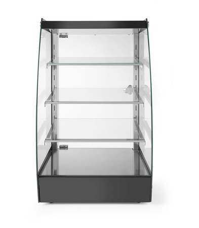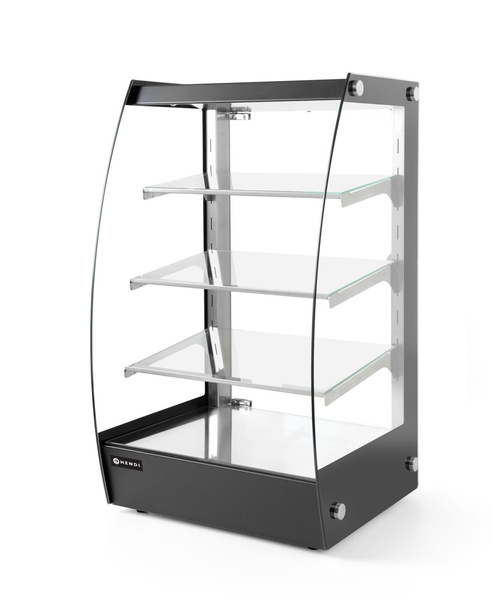 • 3 przestawne szklane półki, nachylone pod lekkim kątem w stronę klienta