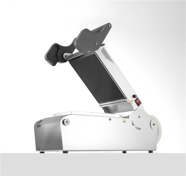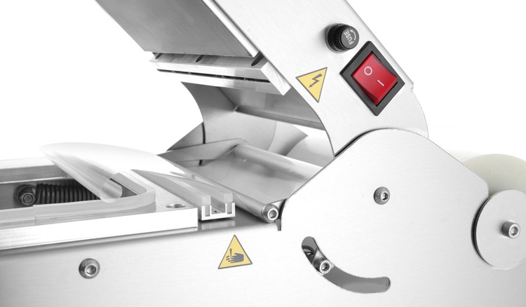 - Automatycznie wysuwana gilotyna z bezpiecznym nożem w specjalnie zaprojektowanej osłonie; cięcie odbywa się tuż za zgrzewanym pojemnikiem w specjalnej listwie (technologia air-cut)