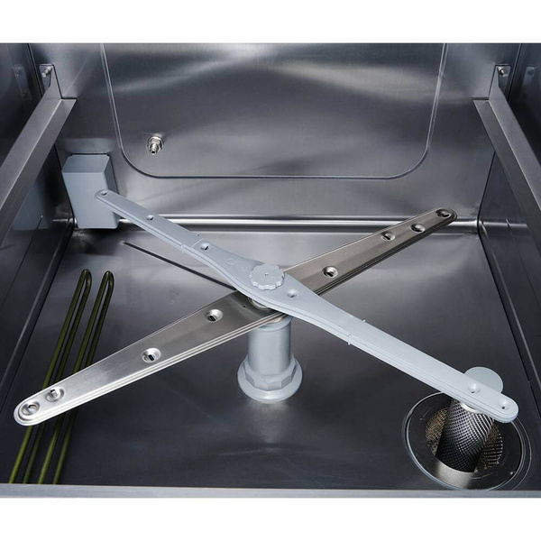 Sterowanie elektromechaniczne umożliwia niezawodną pracę. Urządzenie przystosowane do mycia talerzy, szkła, tac oraz pojemników GN 1/1 o wysokości do 320 mm. Komora wsadowa ma wysokość ok. 370 mm.