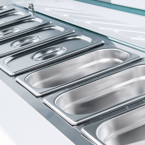 przeznaczona do przechowywania i prezentacji produktów elektroniczny sterownik z cyfrowym wyświetlaczem temperatury urządzenie wykonane ze stali nierdzewnej urządzenie sprzedawane bez pojemników GN automatyczne odszranianie układ pojemników 8 x GN 1/4 (max H = 150 mm) statyczny obieg powietrza zdjęcie poglądowe