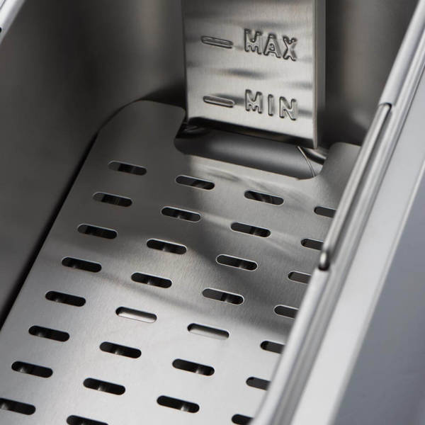 pojemność użytkowa 5 l pojemność minimalna 3.3 l pojemność całkowita 7.8 l solidny kosz frytownicy z przednim mocowaniem oraz żaroodpornym uchwytem regulacja temperatury pokrętłem 60-200°C system zimnej strefy zapobiegający przypalaniu się resztek żywności demontowalny panel sterowania ułatwiający czyszczenie urządzenia
