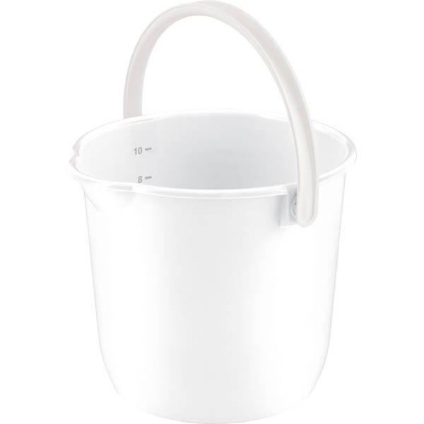 wiadro wykonane z wytrzymałego polietylenu w kolorze białym wykonany z materiału nie absorbującego zapachów oraz smaków wytrzymałość termiczna od -40°C do 90 °C bez pokrywy wewnątrz podziałka na 10l, pojemność całkowita 12l