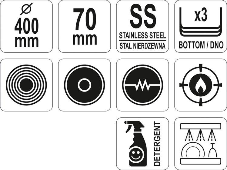 Profesjonalna patelnia indukcyjna ze stali nierdzewnej, o średnicy 40 cm oraz pojemności 8,8 l.Patelnia YATO Professional Kitchen Equipment przeznaczona jest do profesjonalnego wykorzystania w branży gastronomicznej. Doskonale nadaje się do smażenia wszelkiego rodzaju potraw.