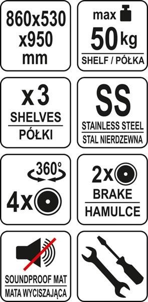Profesjonalny wózek kelnerski YATO o wymiarach 860x530x950 mm jest idealnym rozwiązaniem dla dużych i średnich obiektów gastronomicznych takich jak hotele i restauracje oraz firmy cateringowe. Wysoka jakość wykonania wraz z solidnymi elementami konstrukcji jest gwarancją wieloletniej bezawaryjnej pracy.Technologia montażu, bez widocznych na zewnątrz elementów łączących, gwarantuje elegancką prezencję, zwiększając walory wizualne. Dzięki temu wózek YATO jest dedykowany również dla prestiżowych placówek gastronomicznych.