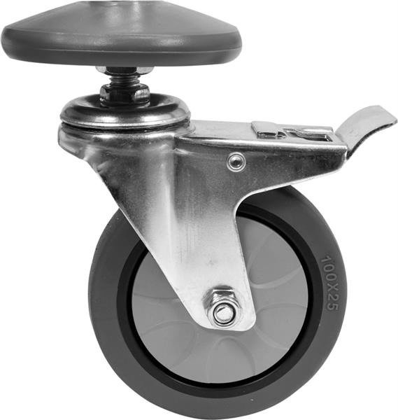 Wózek wyposażony jest w 4 kółka z łożyskami, wykonane z wysokiej jakości szarego TPR. Zastosowanie twardego, a jednocześnie elastycznego materiału zapewnia bardzo cichą pracę. Kółka nie rysują posadzki, nie pozostawiają na niej śladów i są skrętne w zakresie 360°. Umożliwia to manewrowanie w trudno dostępnych pomieszczeniach i wąskich korytarzach.