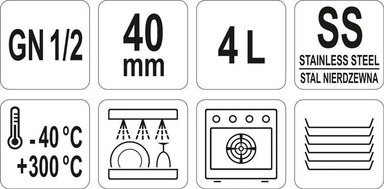 Profesjonalny pojemnik GN marki YATO ze stali nierdzewnej o wymiarach GN 1/2, 40 mm, pojemność 4,0 l.Pojemniki gastronomiczne YATO Proffesional Kitchen Equipment, przeznaczone są do profesjonalnego wykorzystania w placówkach żywienia zbiorowego.
