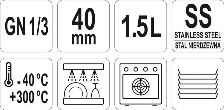 Profesjonalny pojemnik GN renomowanej marki YATO ze stali nierdzewnej o wymiarach GN 1/3, 40 mm, pojemność 1,5 l.