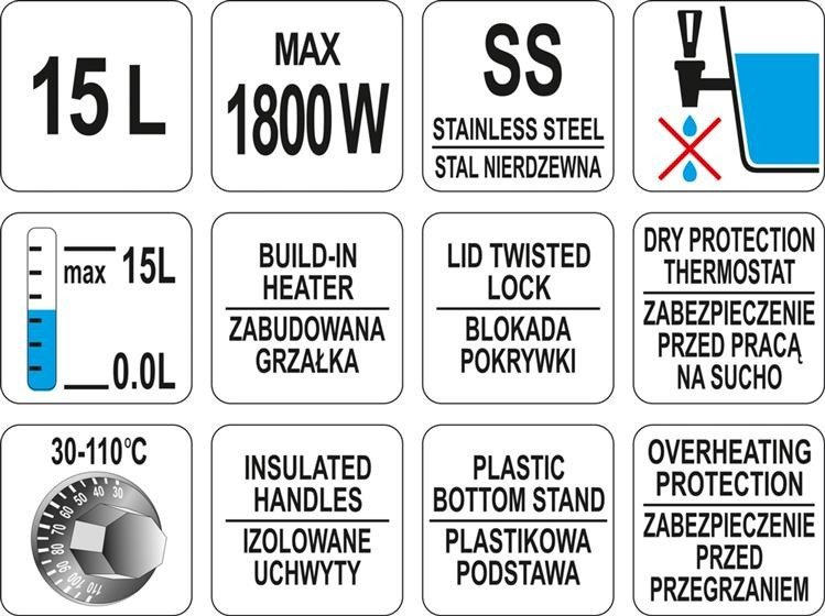 Warnik do wody marki YATO wykonany jest z najwyższej jakości stali nierdzewnej, wypolerowanej na wysoki połysk, dzięki czemu bardzo elegancko prezentuje się w hotelach, salach konferencyjnych czy restauracjach. Wysoka jakość wykończenia połączona jest z niezawodnością wynikającą z użycia bardzo wydajnych grzałek oraz specjalnemu systemowi zabezpieczeń.