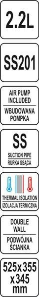 Termos wyposażony jest w pompkę ułatwiającą precyzyjne nalewanie napojów. Natomiast rurka ssąca wykonana jest ze stali nierdzewnej przez co możliwe jest utrzymanie jej w nienagannej czystości bez nadmiernego wysiłku. Termos YATO posiada także zabezpieczenie przed kapaniem, które zapobiega rozlewaniu się napojów. Wygodny plastikowy uchwyt ułatwia transport termosu.