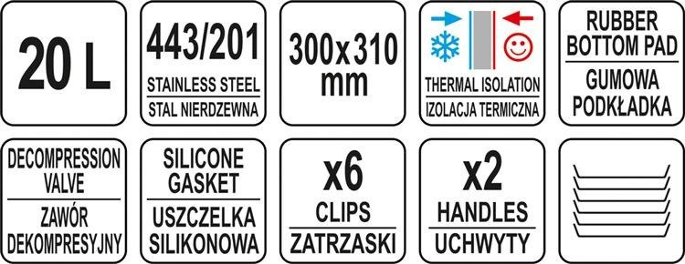 Termos do transportu żywności marki YATO, o pojemności 20 L.Termos marki YATO jest dedykowany dla restauratorów, hotelarzy oraz działalności cateringowej, od małych bankietów po duże imprezy plenerowe. Cechuje go najlepszy na rynku współczynnik ceny do właściwości i jakości produktu.