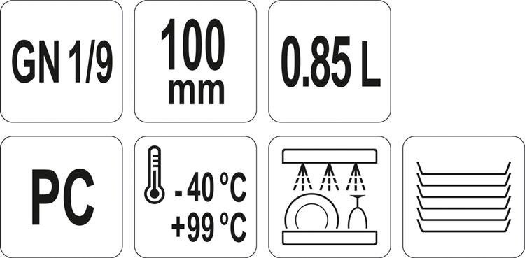 Profesjonalny pojemnik GN renomowanej marki YATO z poliwęglanu o wymiarach GN 1/9 100 mm i pojemności 0,85 l.