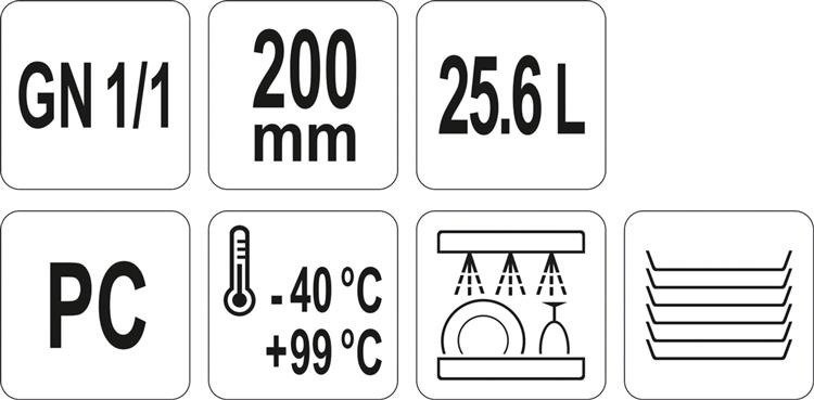 Profesjonalny pojemnik GN marki YATO z poliwęglanu o wymiarach GN 1/1 200 mm i pojemności 25,6 l.