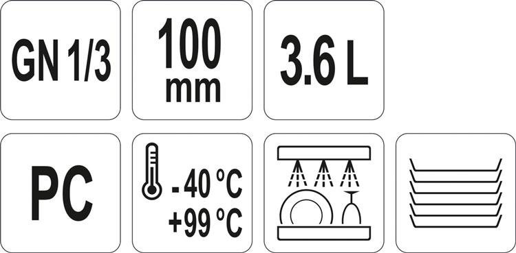 Pojemniki gastronomiczne YATO wyprodukowano z najwyższej jakości poliwęglanu PC, który charakteryzuje się bardzo dużą wytrzymałością i odpornością na uszkodzenia mechaniczne, zapewniając bardzo długą żywotność. Przeznaczone są do profesjonalnego wykorzystania w restauracjach, barach czy placówkach żywienia zbiorowego. Służą przede wszystkim do przechowywania żywności, przypraw, itp. Wyjątkowe właściwości umożliwiają zastosowanie ich w warunkach chłodniczych czy mroźniczych w temperaturrze do - 40°C. Idealnie nadają się również do wykorzystania w zakresie wyższych temperatur sięgających do 99°C. Dzięki temu można je używać do przechowywania gorących potraw. Jednak nie są przeznaczone do stosowania w bemarach czy piecach konwekcyjno-parowych.