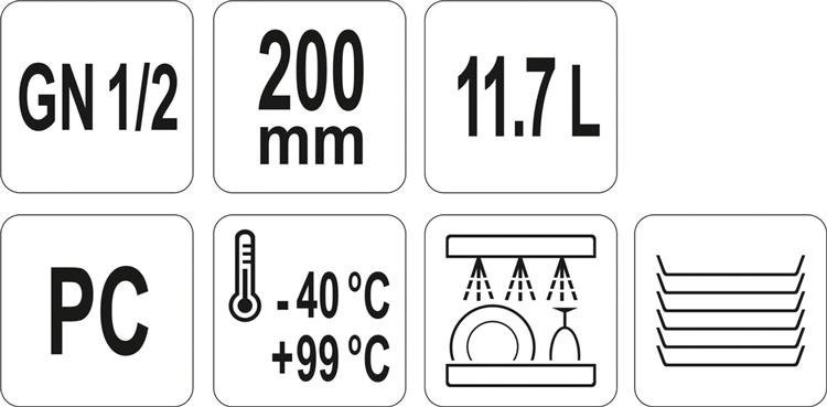 Profesjonalny pojemnik GN marki YATO z poliwęglanu o wymiarach GN 1/2 200 mm i pojemności 11,7 l.