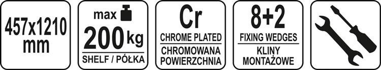 Półka Yato przeznaczona do ażurowego regału, doskonale sprawdzającego się w kuchniach, magazynach, sklepach, warsztatach. Wzmocnienie sprawia, że nośność każdej półki wynosi aż 200 kg, a całego regału – 800 kg. Chromowana powierzchnia gwarantuje ochronę przed korozją i uszkodzeniami eksploatacyjnymi, a druciana konstrukcja gwarantuje produktom idealną wentylację.