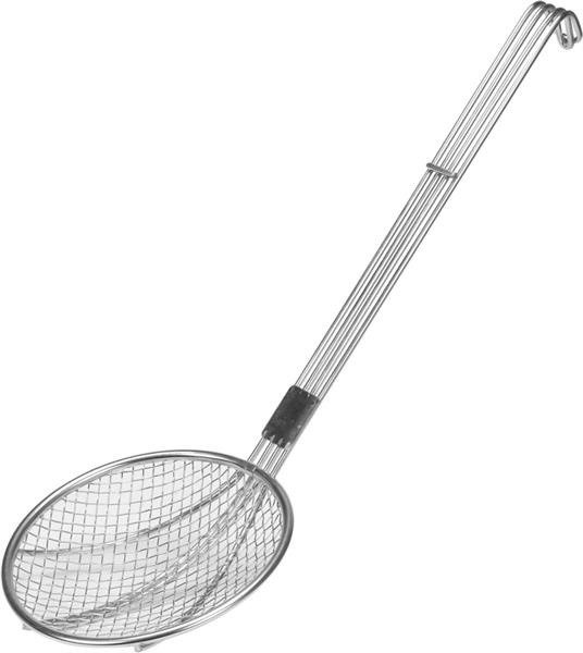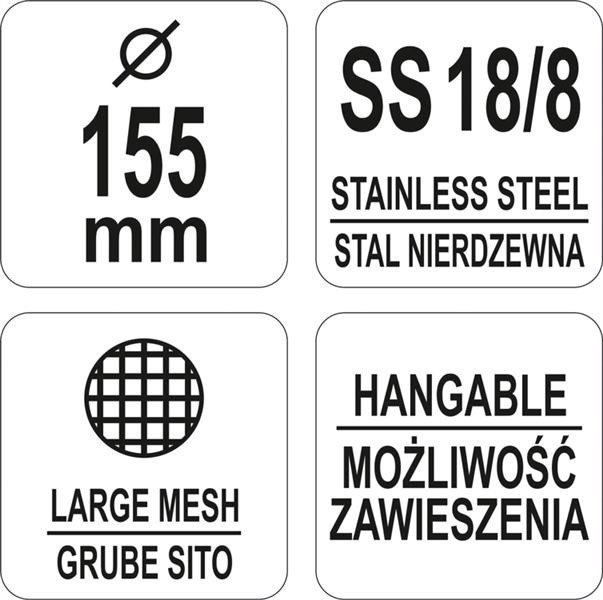 Zewnętrzna średnica cedzaka wynosi 155mm. Natomiast wzmacniana rękojeść z uchwytem o długości 33cm wykonana jest z drutów o grubości 4mm. Dzięki temu łyżka jest bardzo wytrzymała. Cedzak posiada grube oczka o rozmiarze: 6mm x 6mm.