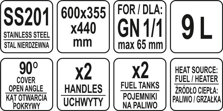 W zestawie posiada pojemnik GN 1/1 o wysokości 65mm wykonany ze stali nierdzewnej o pojemności 9L. Ponadto podgrzewacz ma 2 pojemniki na pastę. Przystosowany jest także do zamocowania grzałki pod spodem pojemnika.