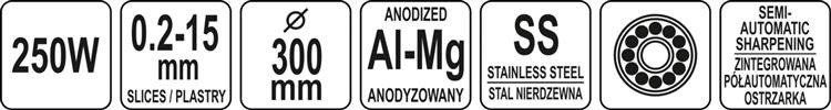 Tarcza tnąca o średnicy 300mm umożliwia krojenie produktów o średnicy sięgającej do 200mm. Dzięki płynnej regulacji grubości krojenia możliwe jest cięcie plastrów o grubości od 0,2 do 15mm.