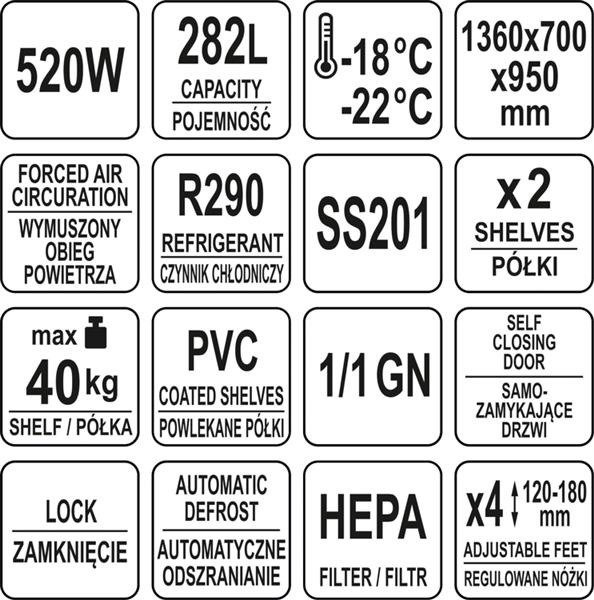 Stół chłodniczy o wymiarach 1360x700x950mm ma pojemność komory 282L. Przeznaczony jest do przechowywania żywności w zakresie temperatur -18~-220C.