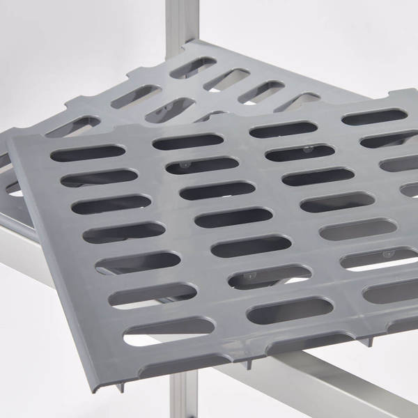 Regał magazynowy wykonany z aluminium z półkami z tworzywa ABS.