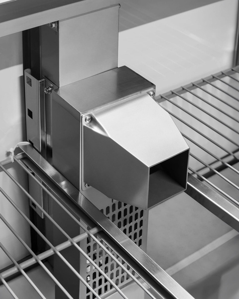 - Stół posiada specjalne wycięcie na pojemniki GN1/6 o głębokości 15 cm na półprodukty takie jak szynka, pomidory, salami, pieczarki itp.