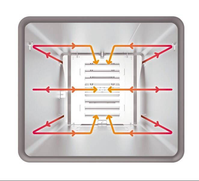 Szybsze i bardziej równomierne gotowanie dzięki termodynamicznej konstrukcji wentylatora w połączeniu z z inteligentnym zarządzaniem prędkością i kierunkiem obrotów