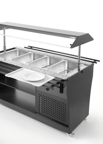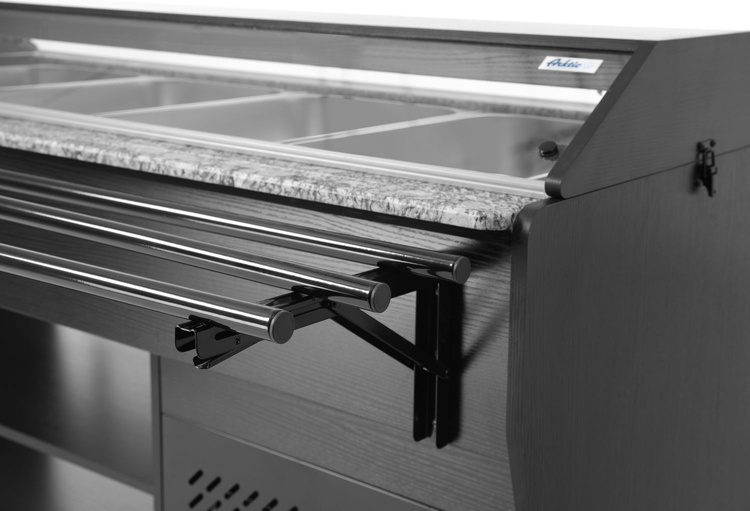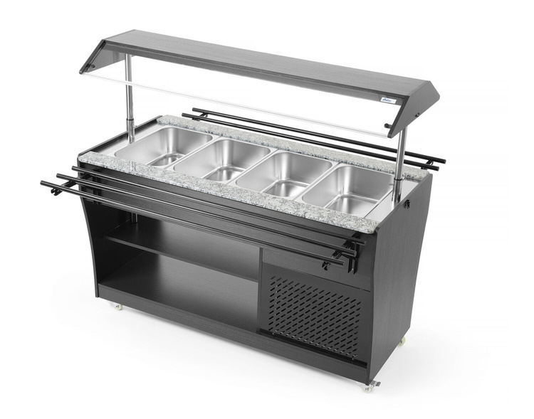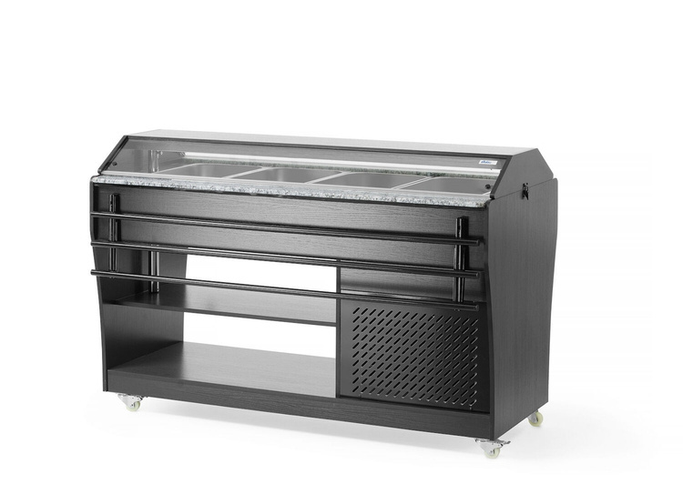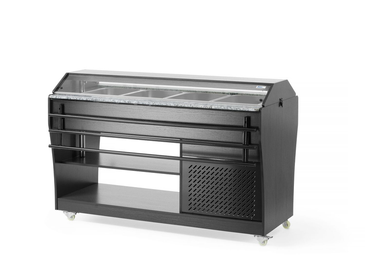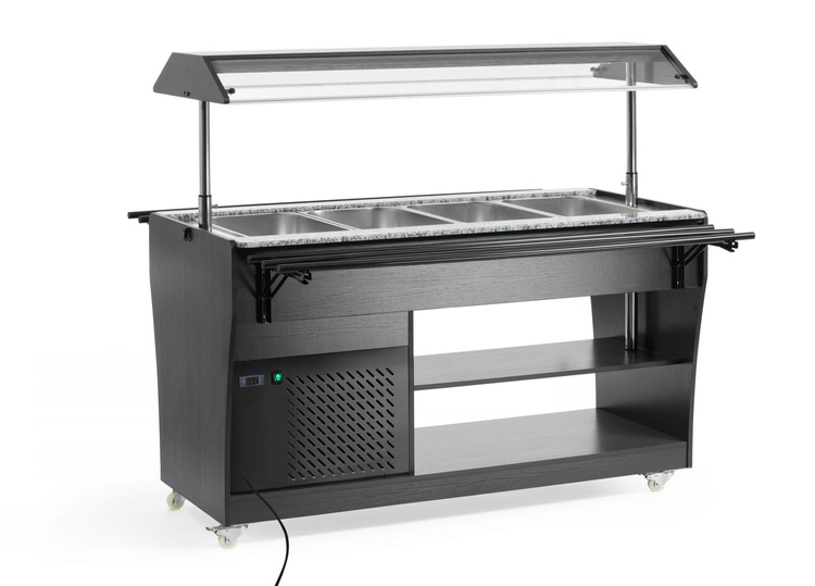 Bufet sałatkowy firmy Arktic oferuje miejsce na 4 pojemniki GN 1/1, które są zawarte w zestawie. Bufet jest wyposażony w oświetlenie w daszku, posiada 2 półki pod spodem do przechowywania talerzy i sztućców oraz jest z łatwością można go przemieszczać dzięki 4 kółkom. Ten bufet to idealne rozwiązanie dla restauracji samoobsługowych lub dla cateringów, ponieważ posiada półkę na tace po obu stronach i utrzymuje żywność w idealnie chłodnych warunkach.