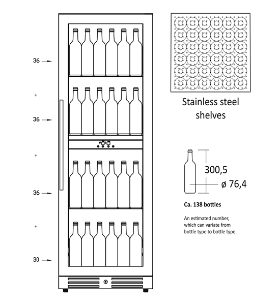 - Winiarka może pomieścić 138 butelek rozmieszczonych na 3 stalowych półkach