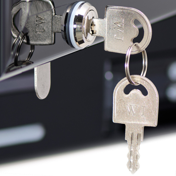 - Przeszklone drzwi z zamkiem – podwójna, bezpieczna szyba z możliwością zamknięcia na klucz.