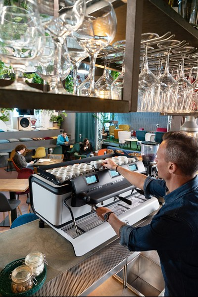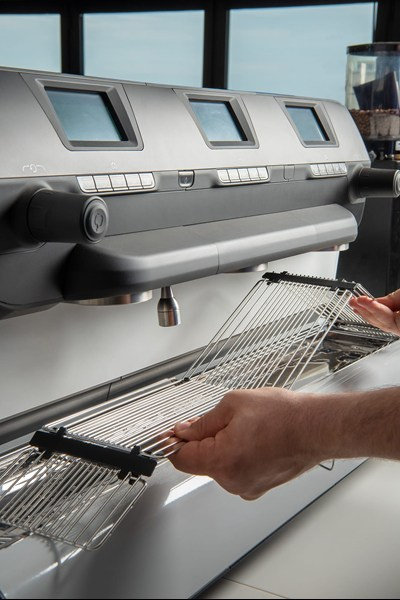 - Niskie urządzenie (maksymalna wysokość to 477 mm) pozwala na prowadzenie rozmów z klientami podczas parzenia kawy