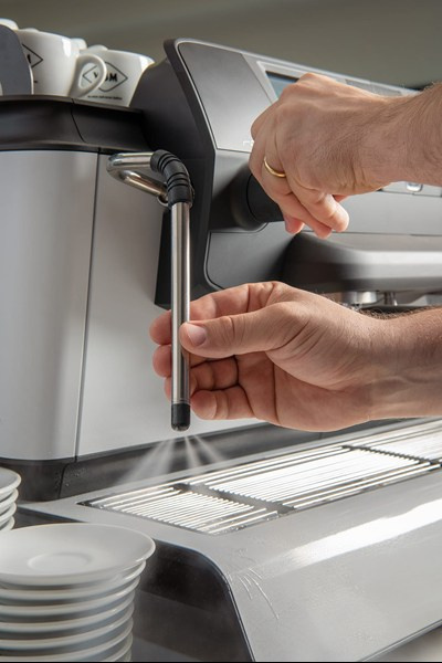 - Dysze do spieniania mleka typu Cool Touch wyposażone w przycisk do natychmiastowego uwolnienia pełnej mocy pary oraz pokrętła do regulacji intensywności pary