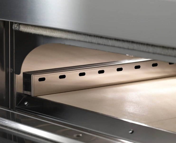 • Komora wyłożona jest płytą z kordierytu, który bardzo dobrze absorbuje i równomiernie rozprowadza ciepło oraz zapewnia doskonałą cyrkulację powietrza pod pizzą. Dzięki temu ciasto jest idealnie wypieczone