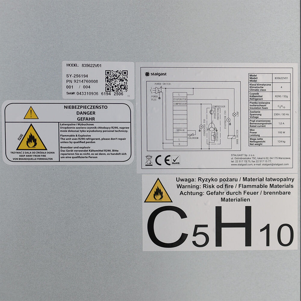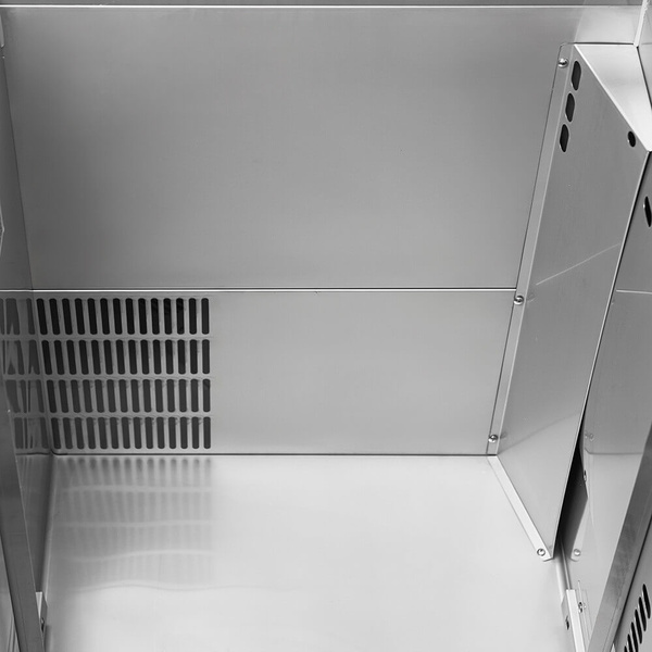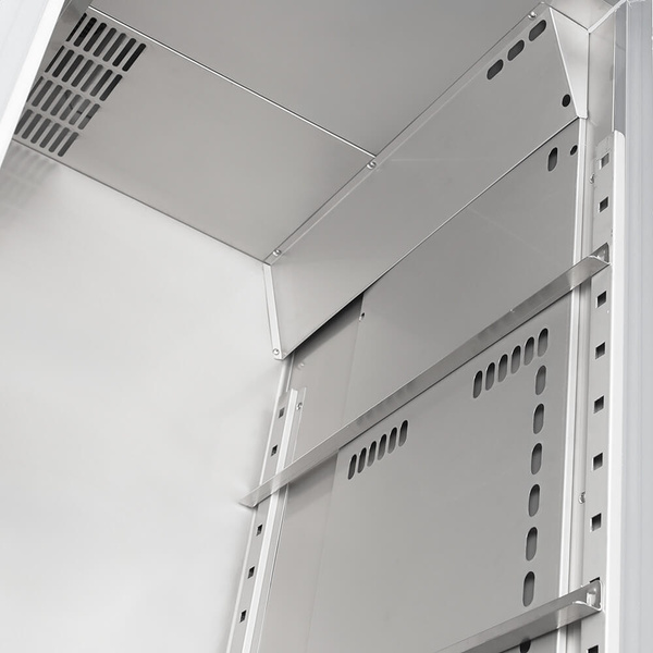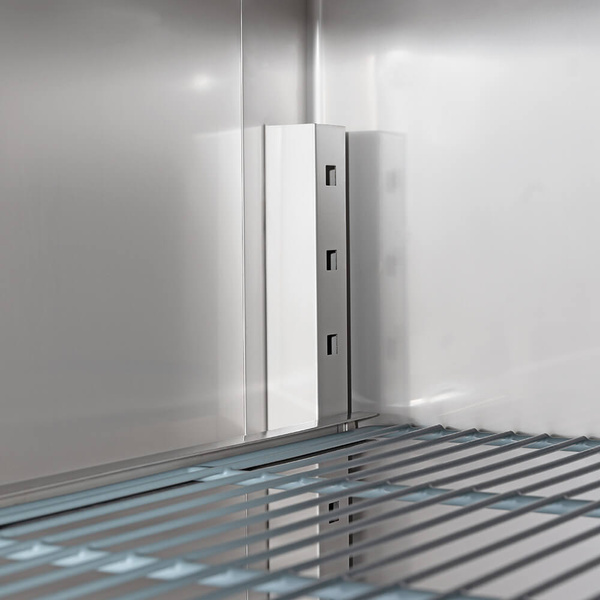 urządzenia posiadające niską klasę energetyczną czynnik chłodniczy R290 obudowa ze stali nierdzewnej wymuszony obieg powietrza automatyczne odszranianie/rozmrażanie elektroniczny sterownik z wyświetlaczem temperatury samodomykające się drzwi regulowane nóżki (+45 mm) profilowany uchwyt otwierania drzwi drzwi z zamkiem oświetlenie Led 4 półki GN 2/1 w standardzie dedykowane półki - nr kat. 830645