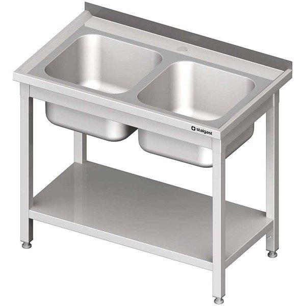 Stół stalowy z półką ze zlewem 2-komorowym, skręcany, blat tłoczony, 1000x600x850 mm 613706 STALGAST