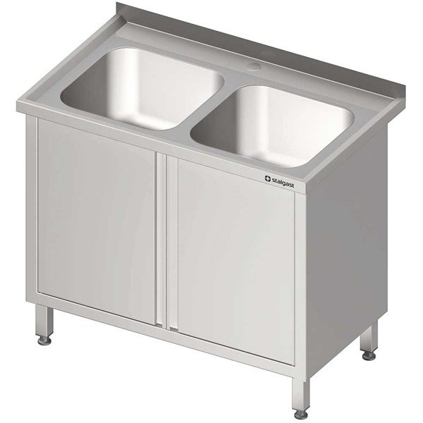 Stół stalowy ze zlewem 2-komorowym, drzwi skrzydłowe, blat tłoczony, 1000x600x850 mm 616306 STALGAST